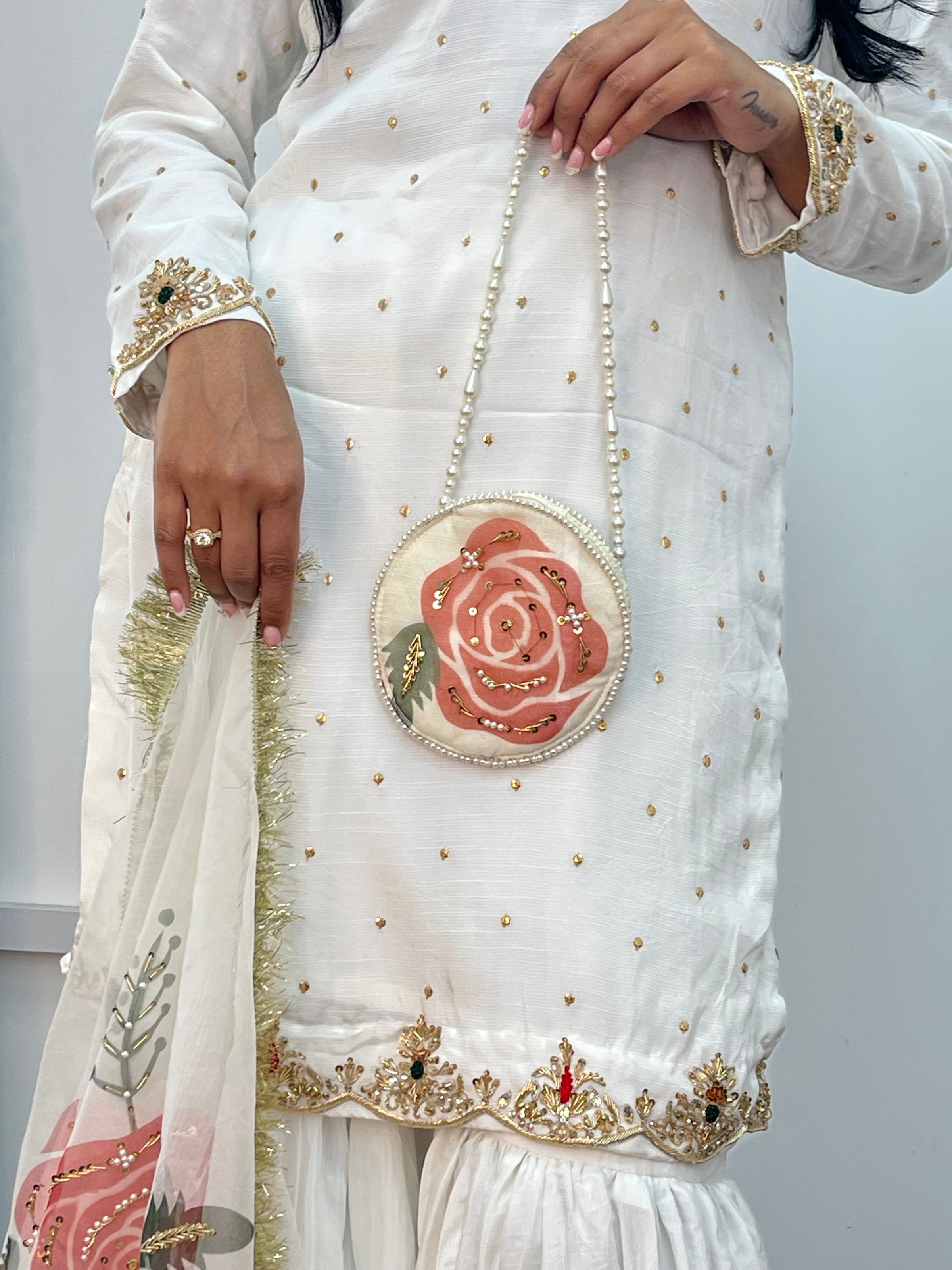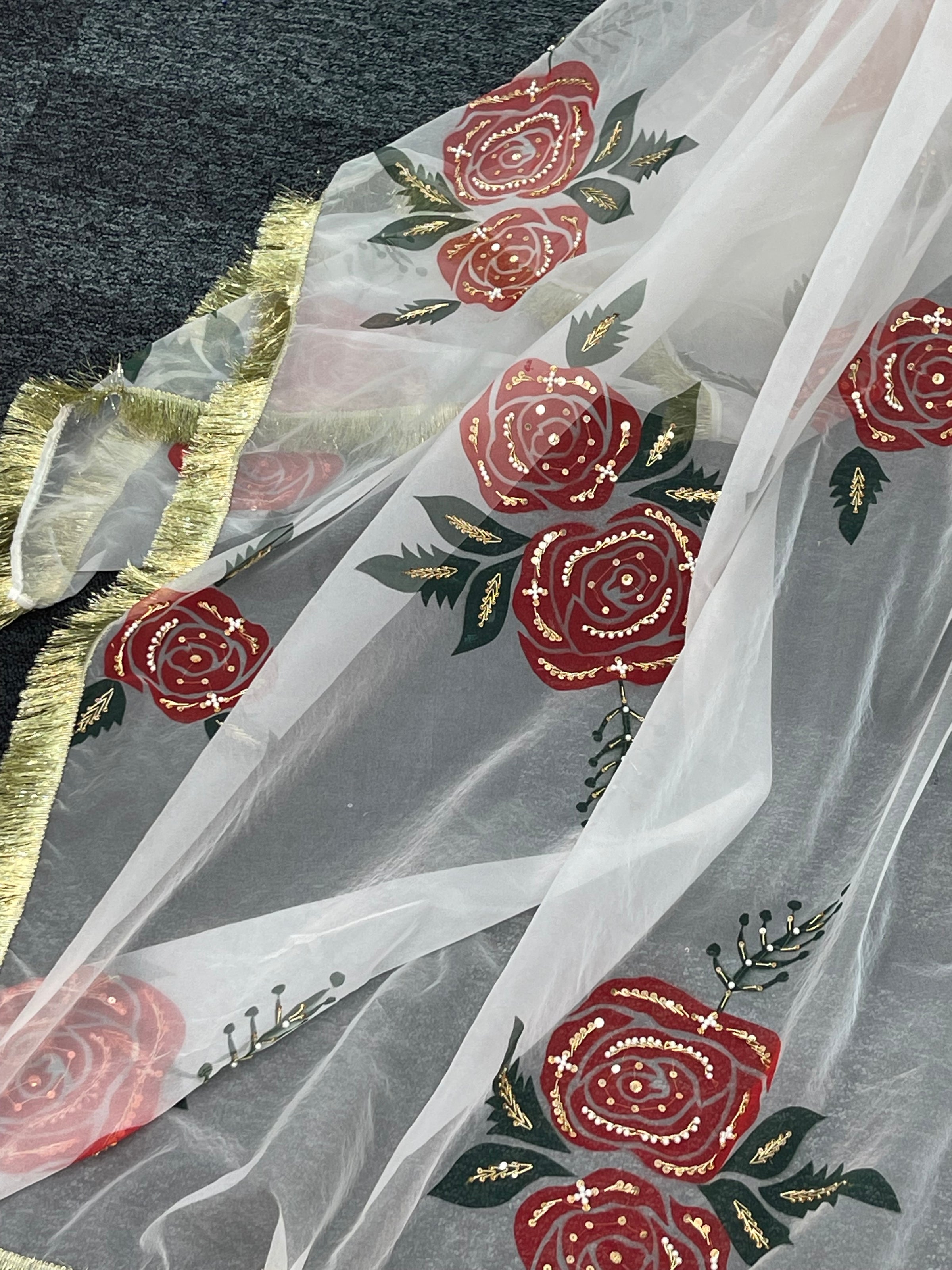 Our stunning dupatta completes the look, featuring elegant hand-painted accents complemented by lavish handwork. Adorned with four-sided kiran, it adds an ethereal charm, making it a perfect choice for your Nikkah celebration.
