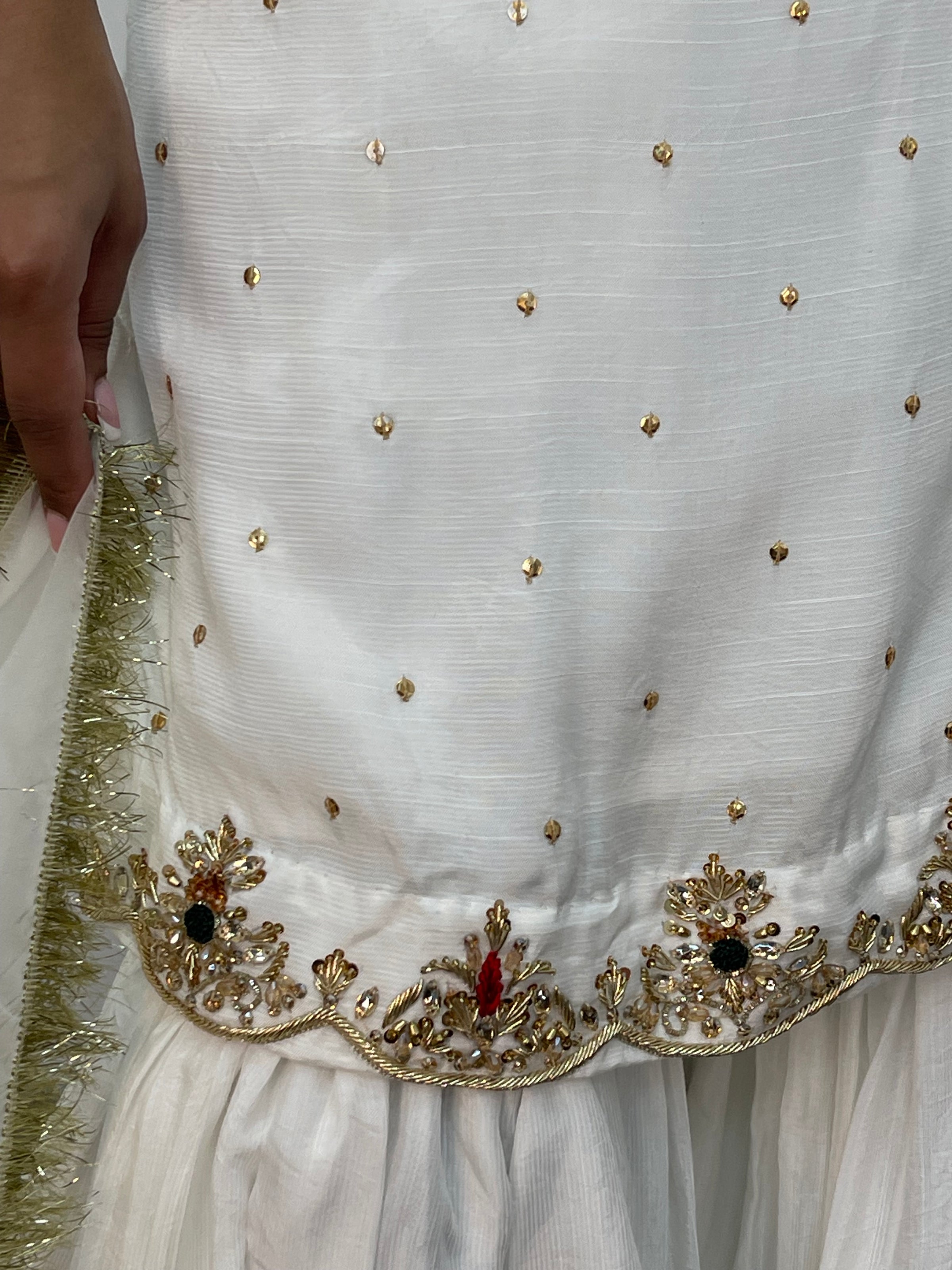The accompanying shirt is a masterpiece of craftsmanship, showcasing intricate handwork on the neckline, daman, and sleeves. The addition of a gold sequin chun adds a touch of luxury, creating a harmonious blend of tradition and modernity.