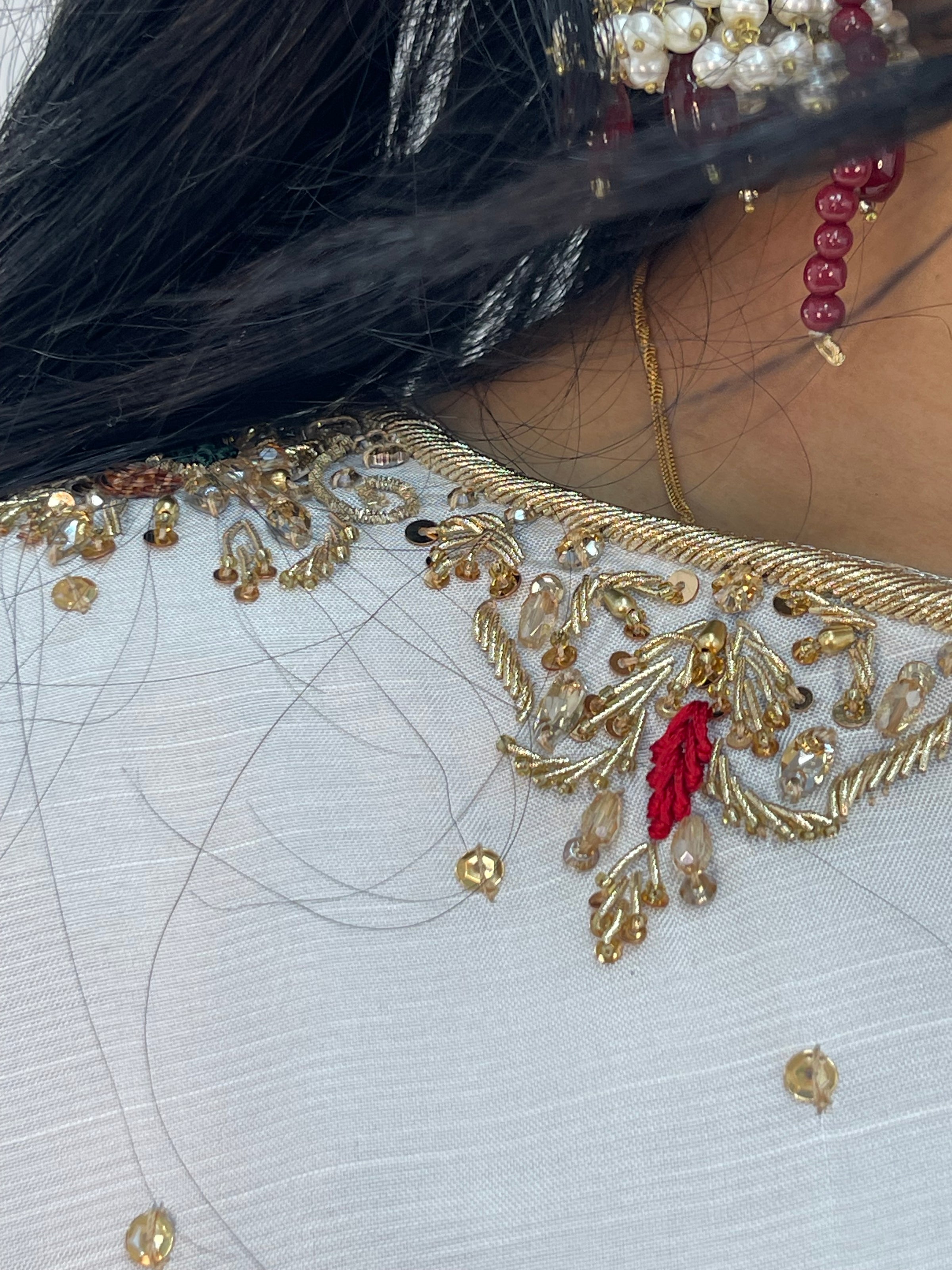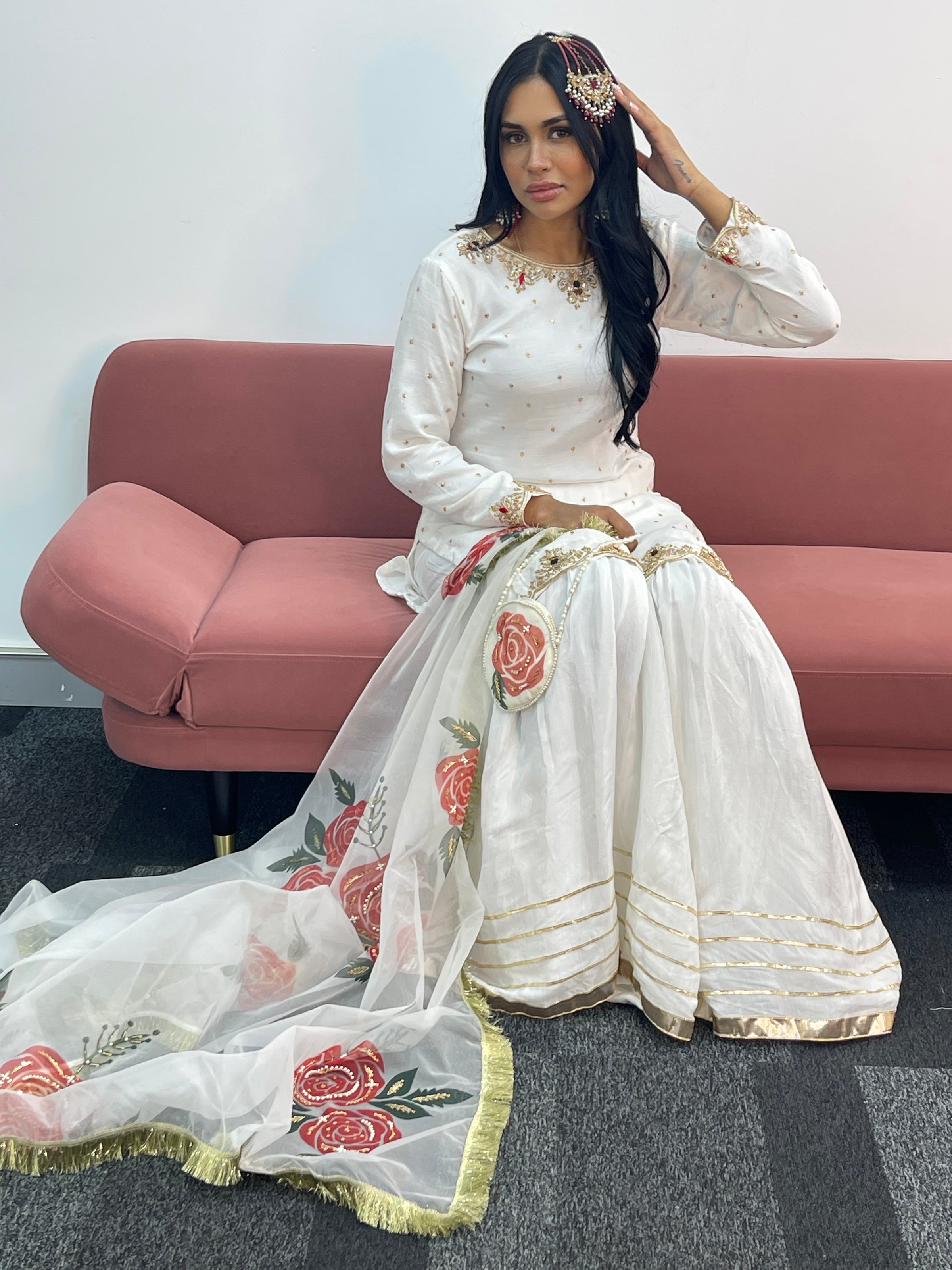 This classic ensemble features a garara with a striking flare adorned with exquisite goti details, ensuring you stand out on your special day.