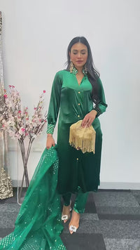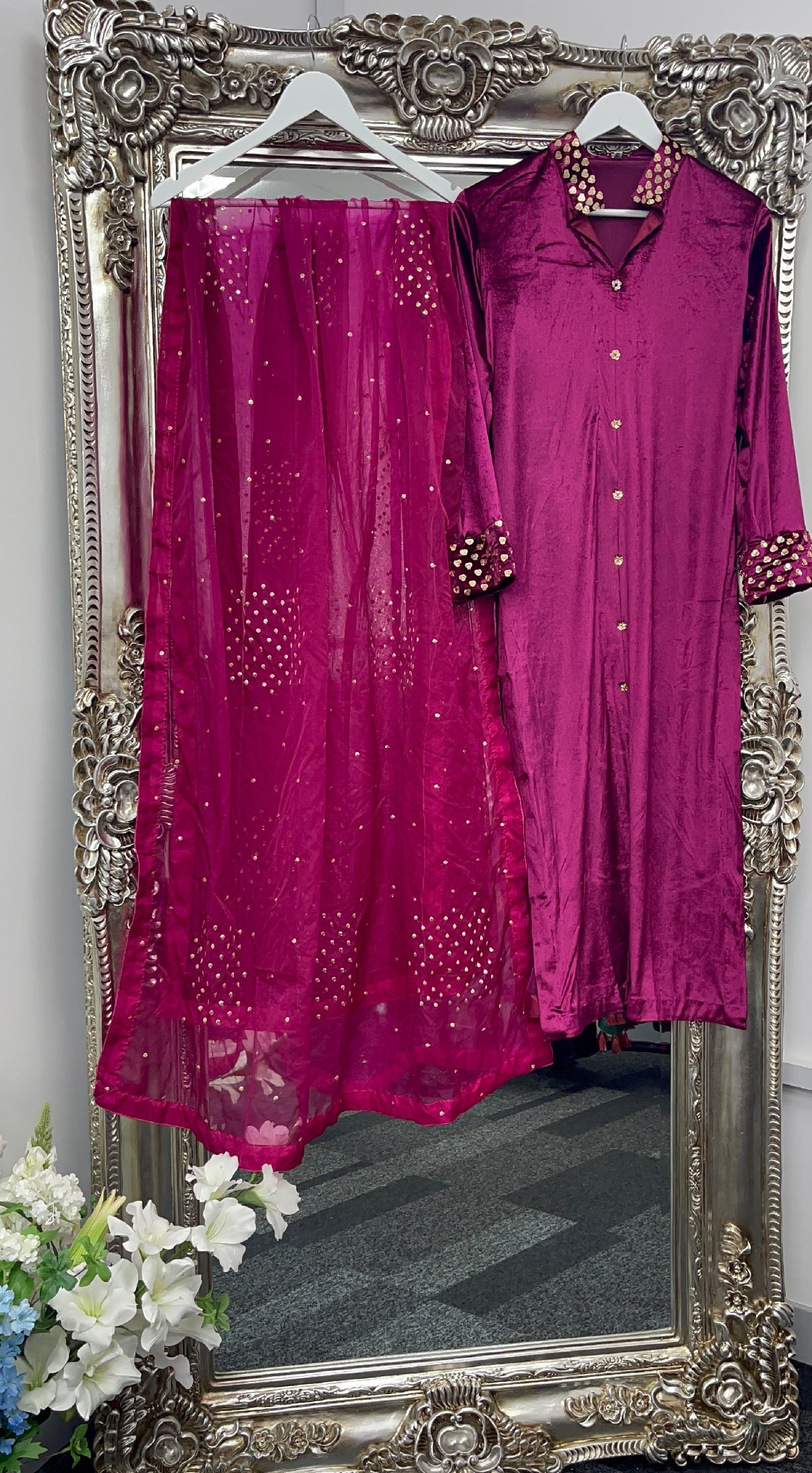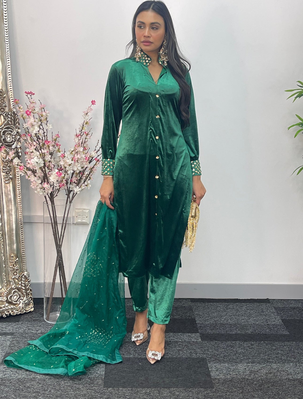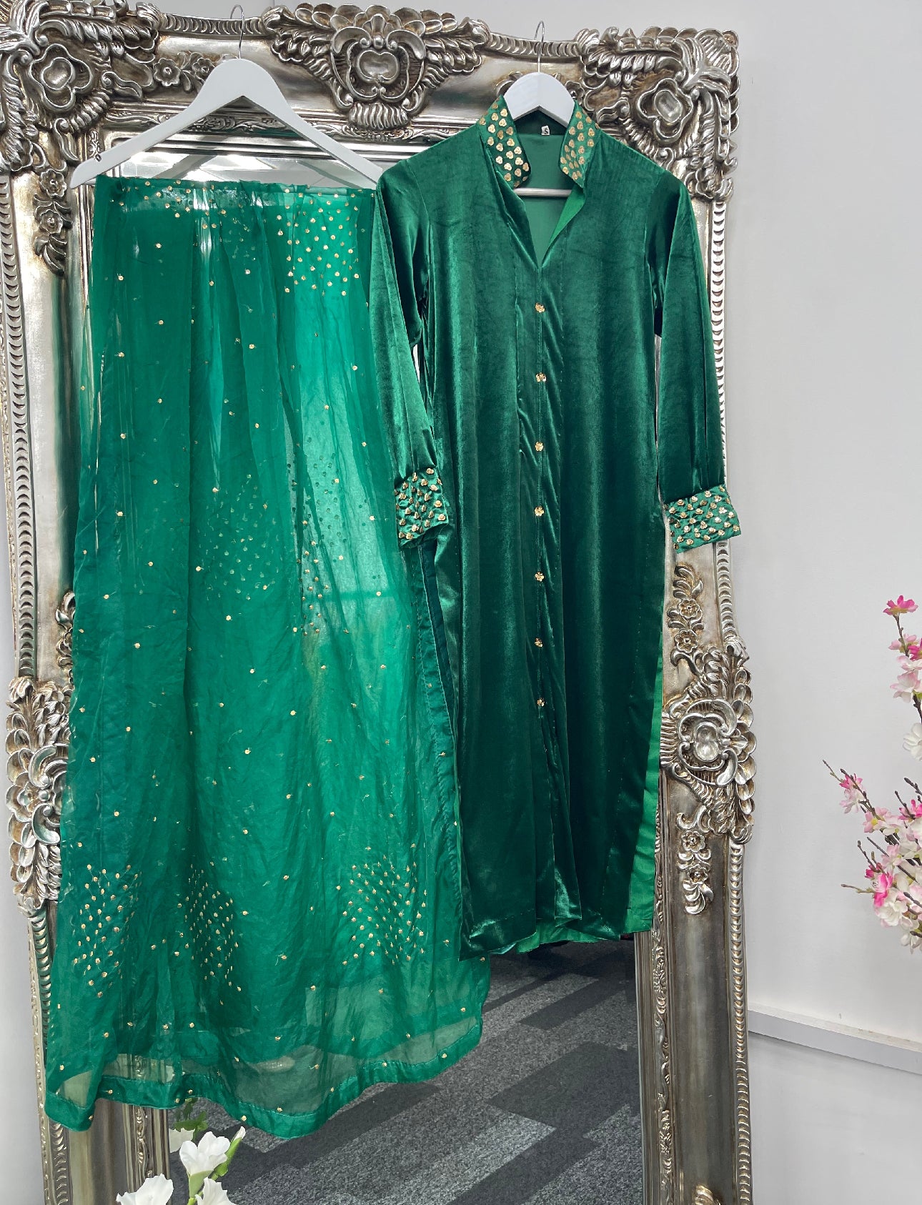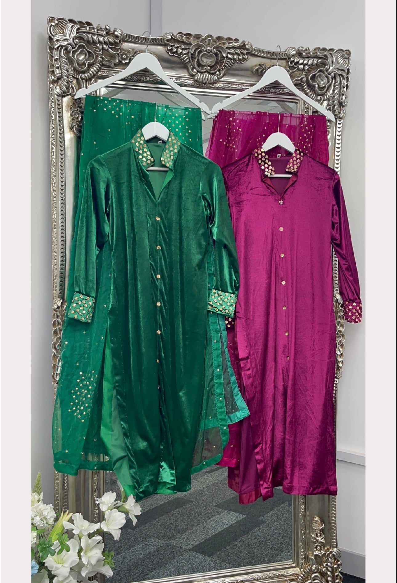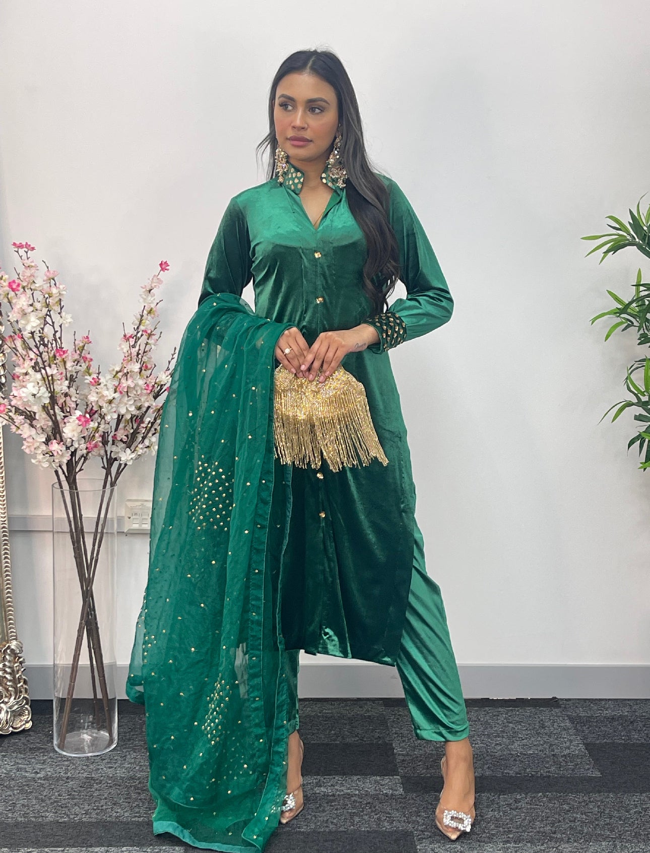 ntroducing our elegant Silk Velvet open-style shirt, featuring exquisite gold buttons and sequin handwork on the neckline and cuffed sleeves.