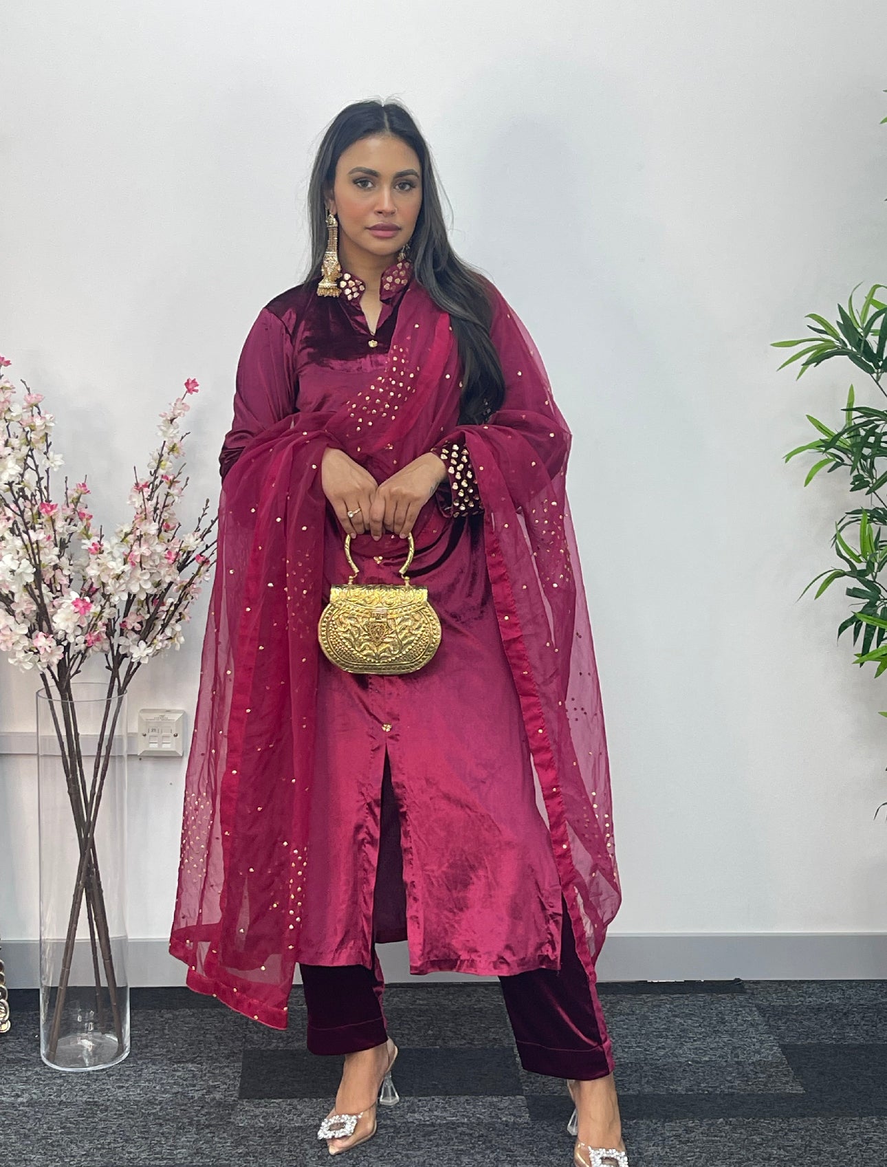 This ensemble is complemented by a stunning organza dupatta adorned with luxurious handwork, perfectly paired with plain pants for a refined look.