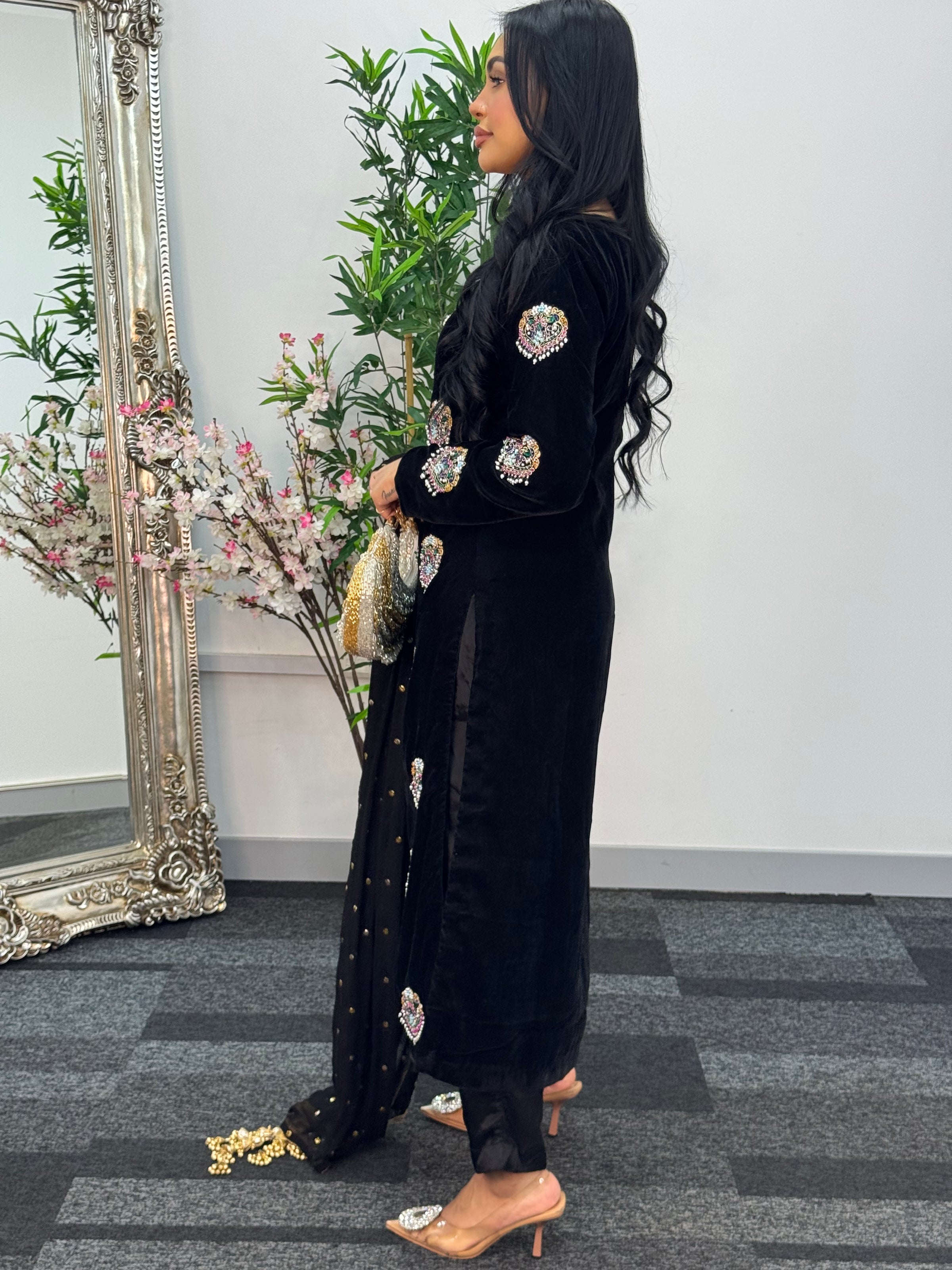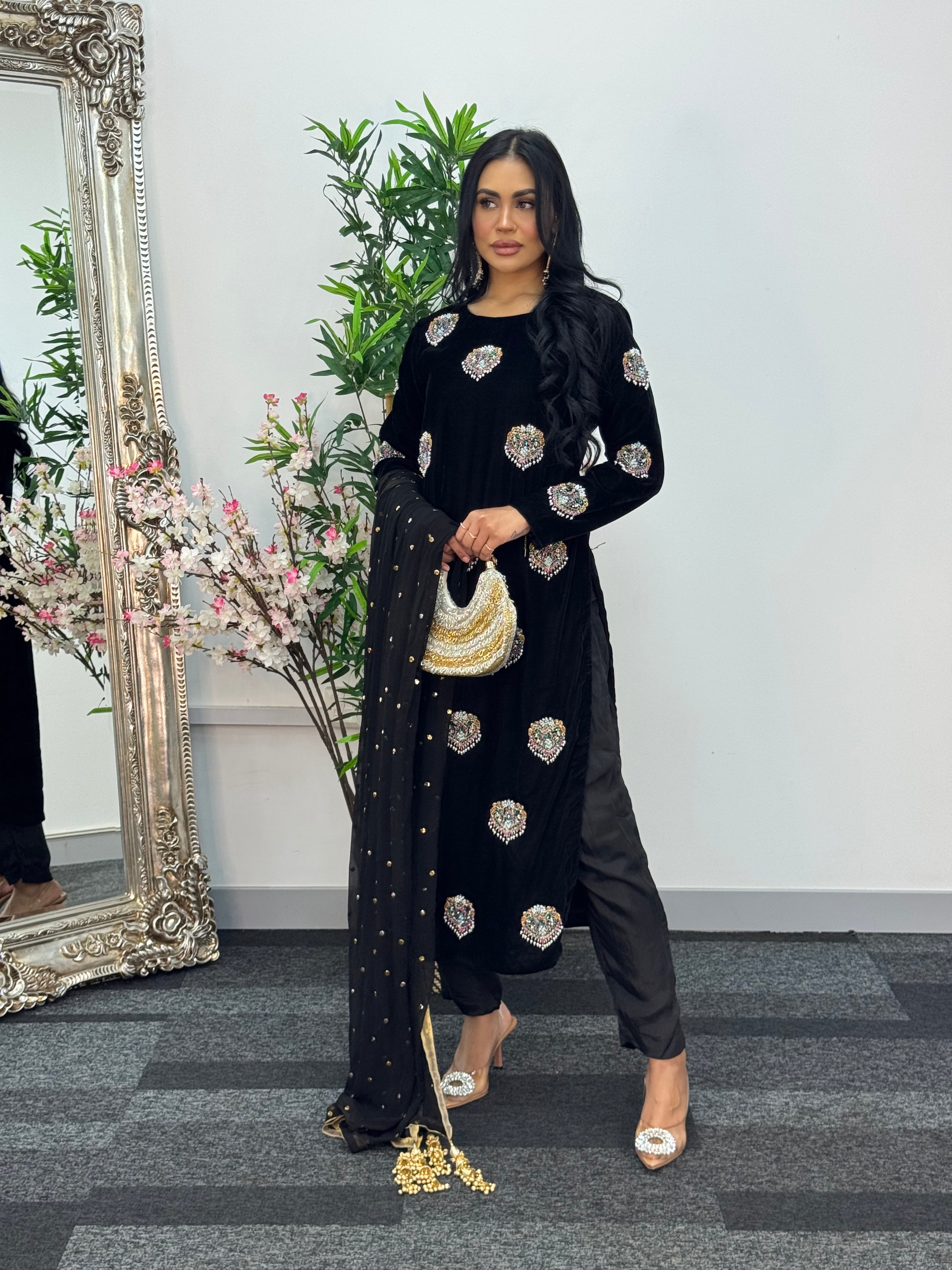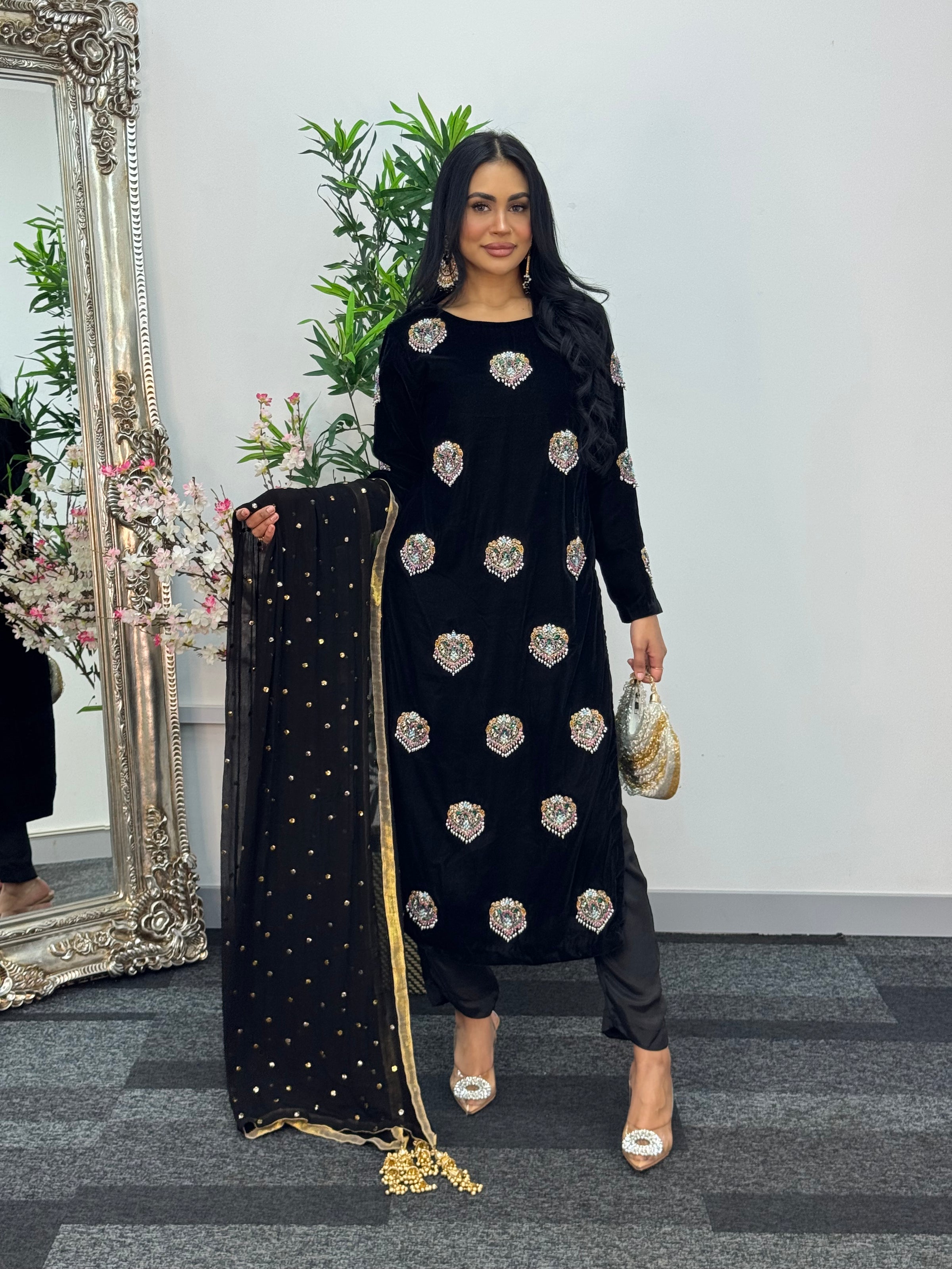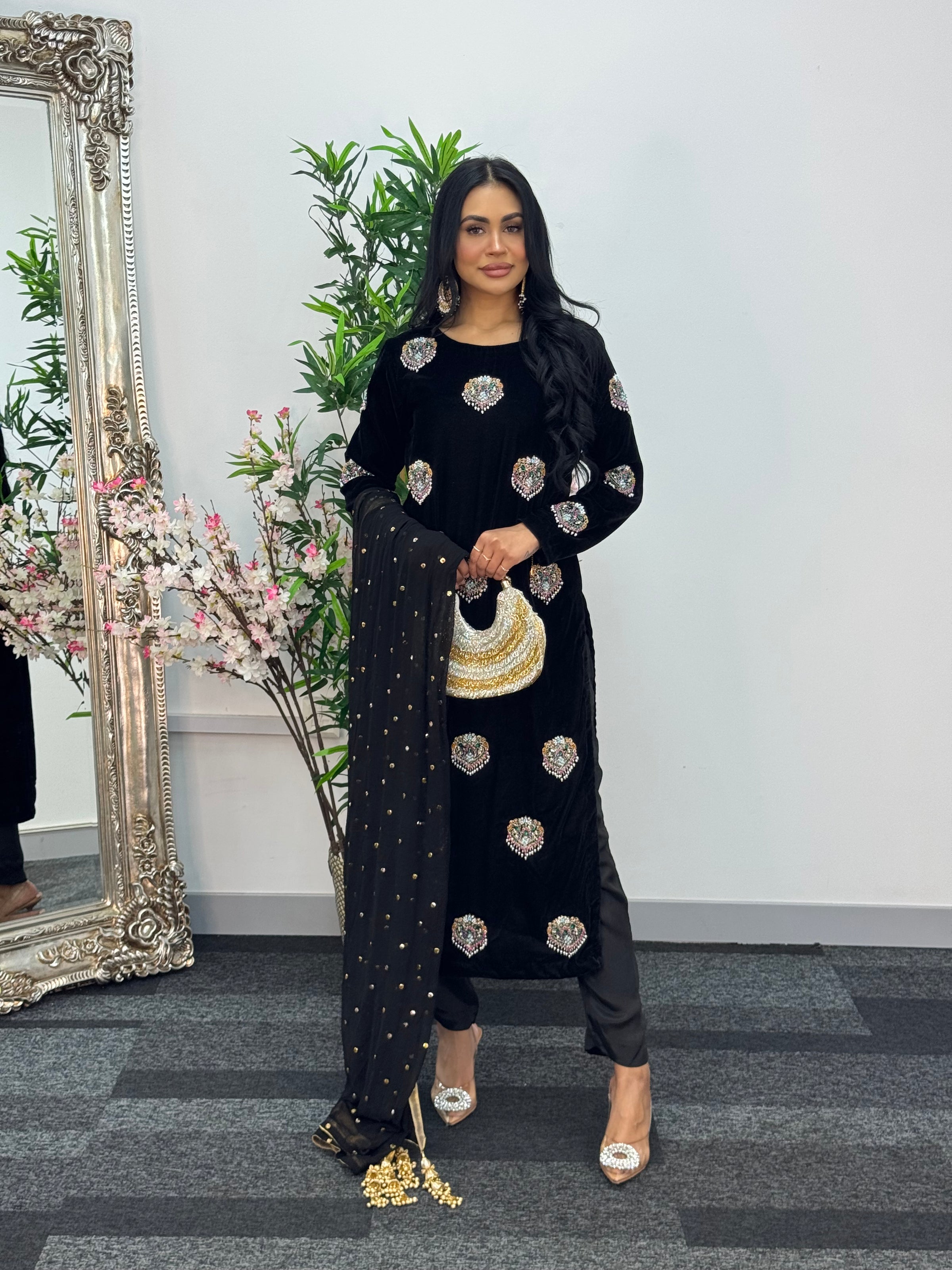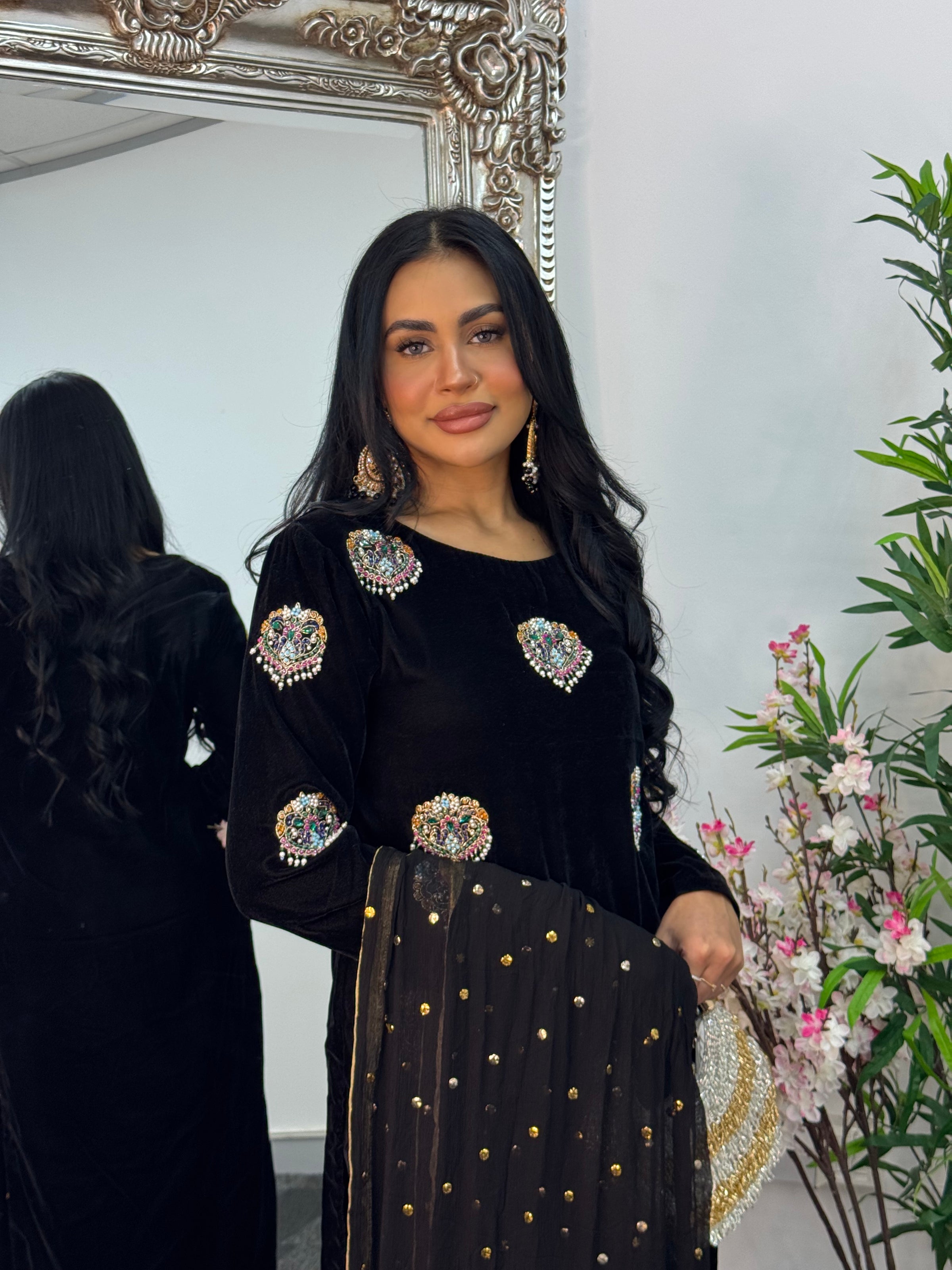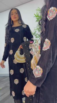 Elevate your wardrobe with this breathtaking black ensemble crafted from luxurious velvet. The shirt features stunning hand-worked motifs that exude elegance and timeless charm, perfectly complemented by a straight pants. Paired with a delicate Mukesh dupatta adorned with tassels on all four corners, this outfit is the epitome of sophistication and refined beauty — perfect for making a lasting impression at any special occasion.
