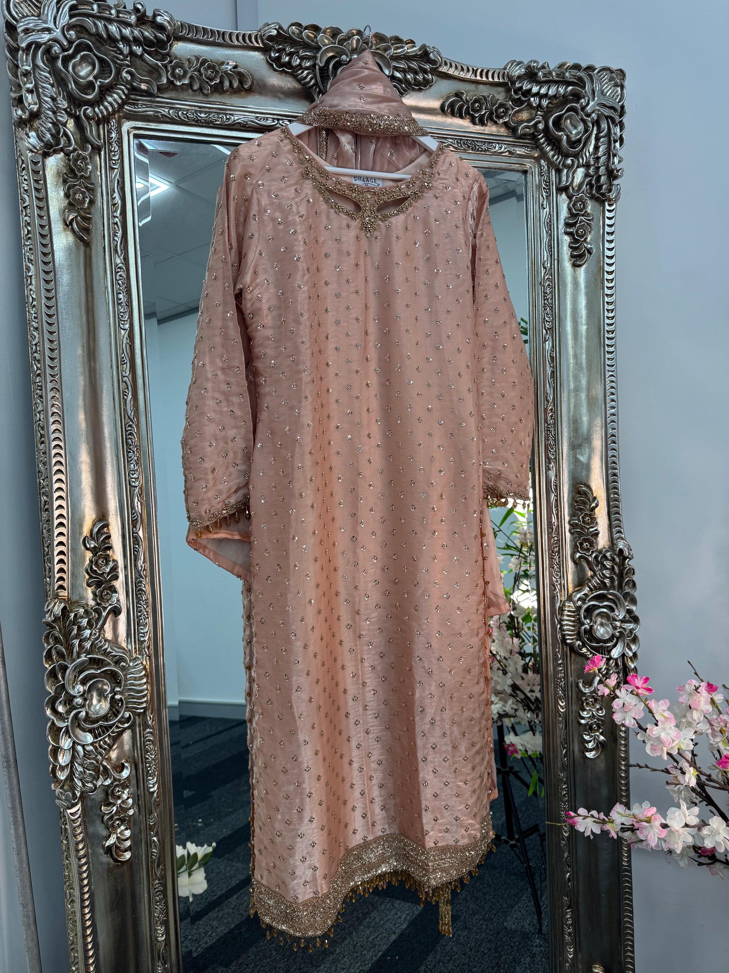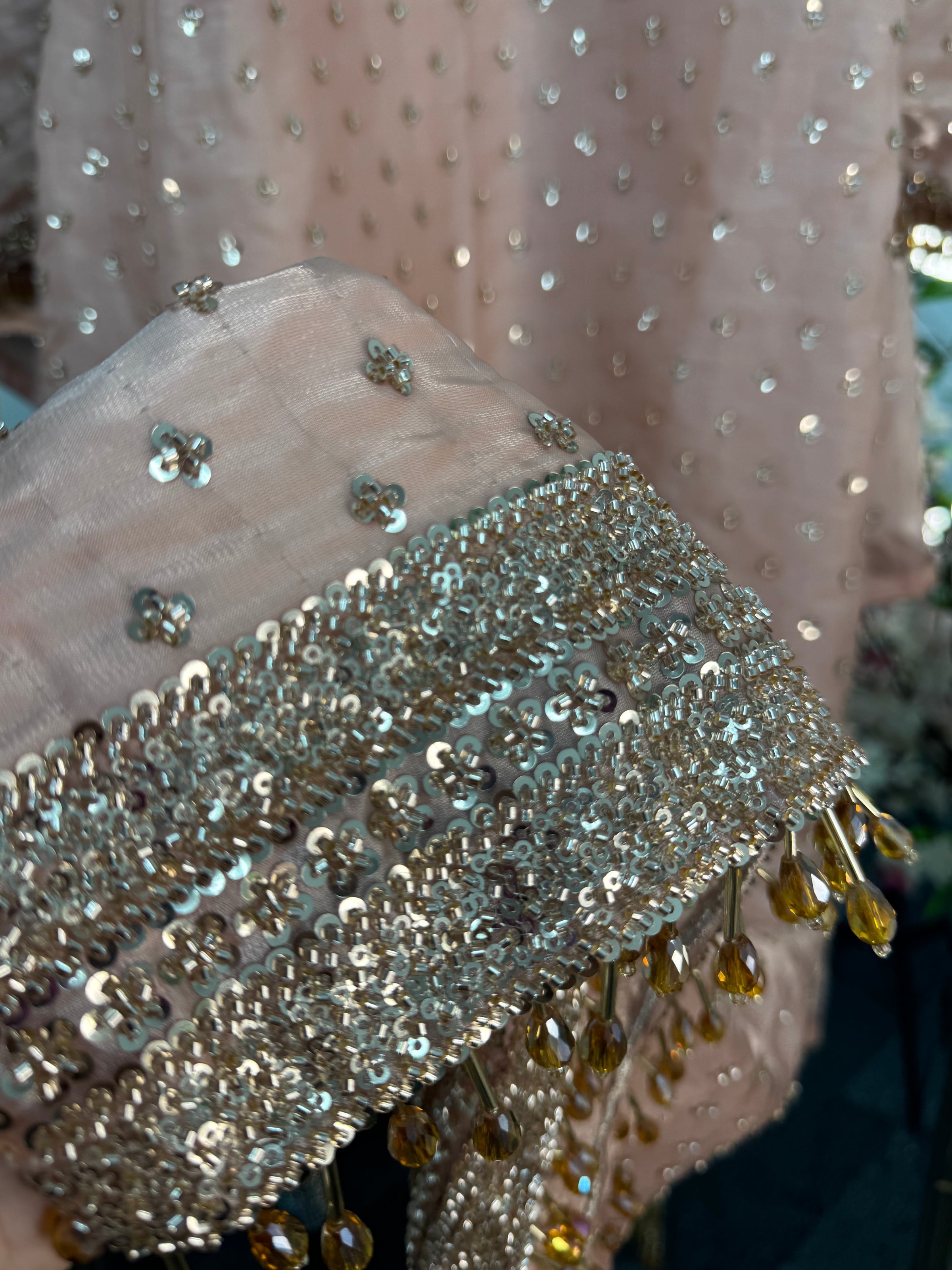A stunning expression of luxury craftsmanship, this design features exquisite hand-embroidered Cutdana work adorning the neckline.