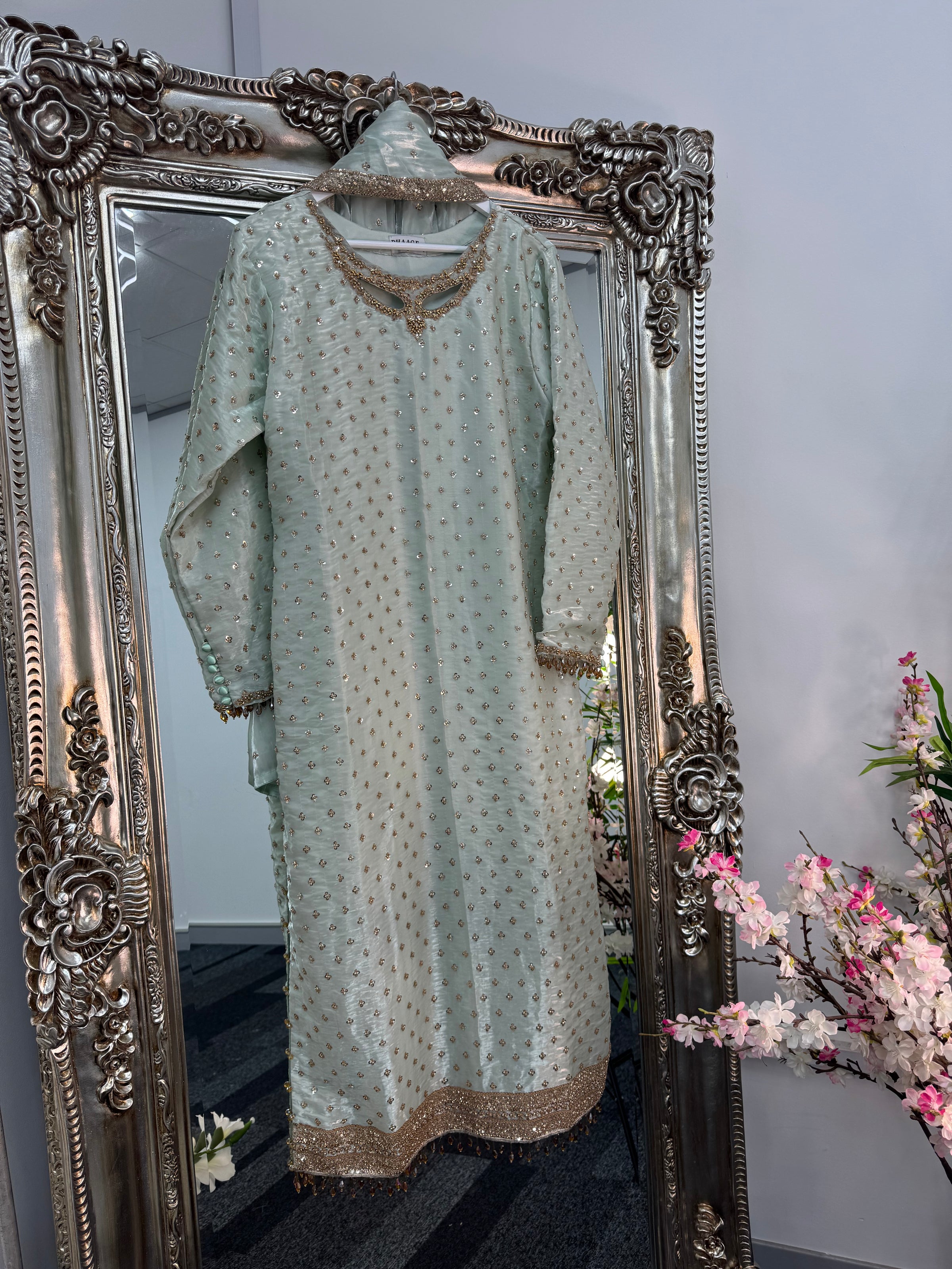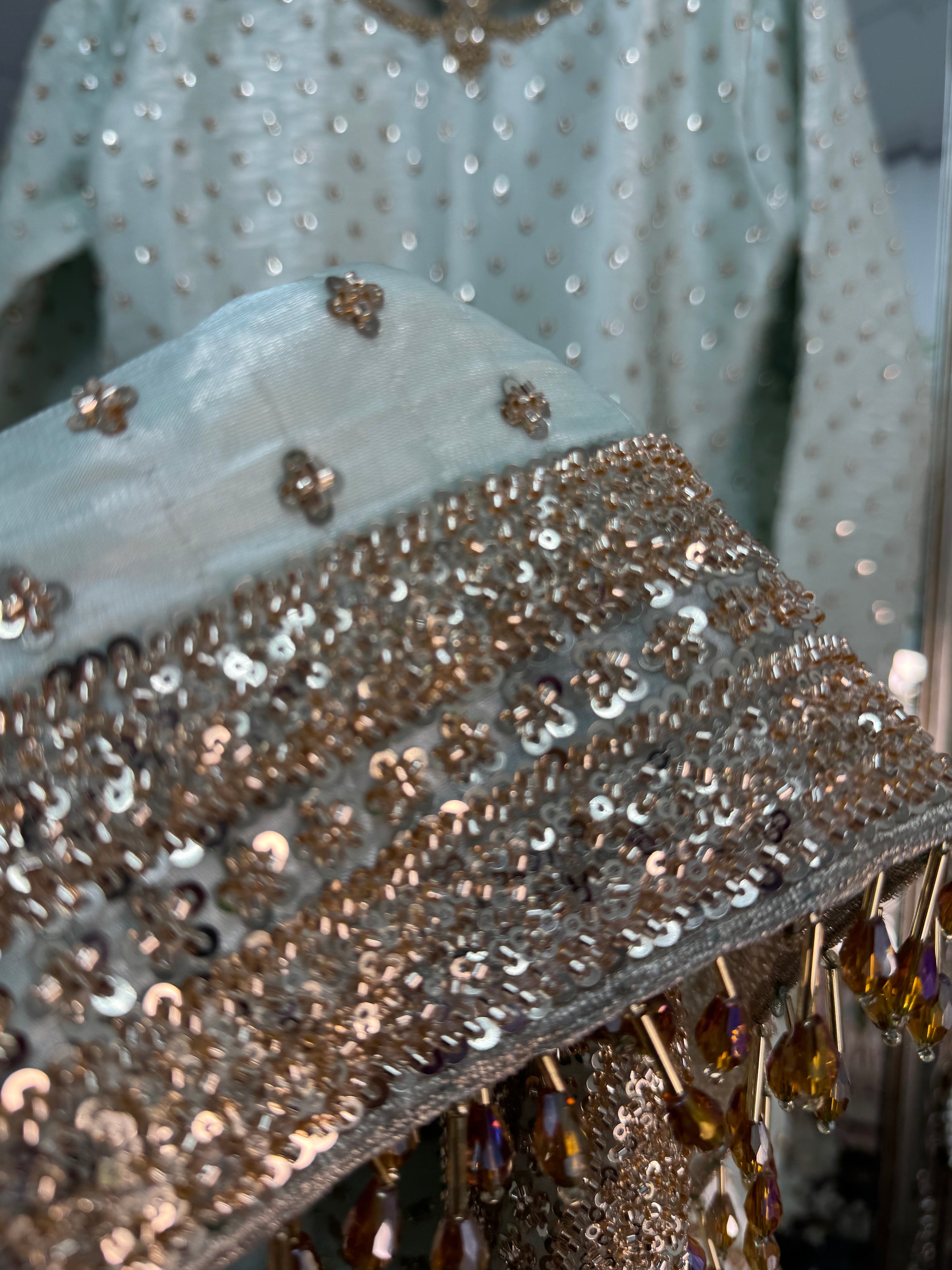 A stunning expression of luxury craftsmanship, this design features exquisite hand-embroidered Cutdana work adorning the neckline.