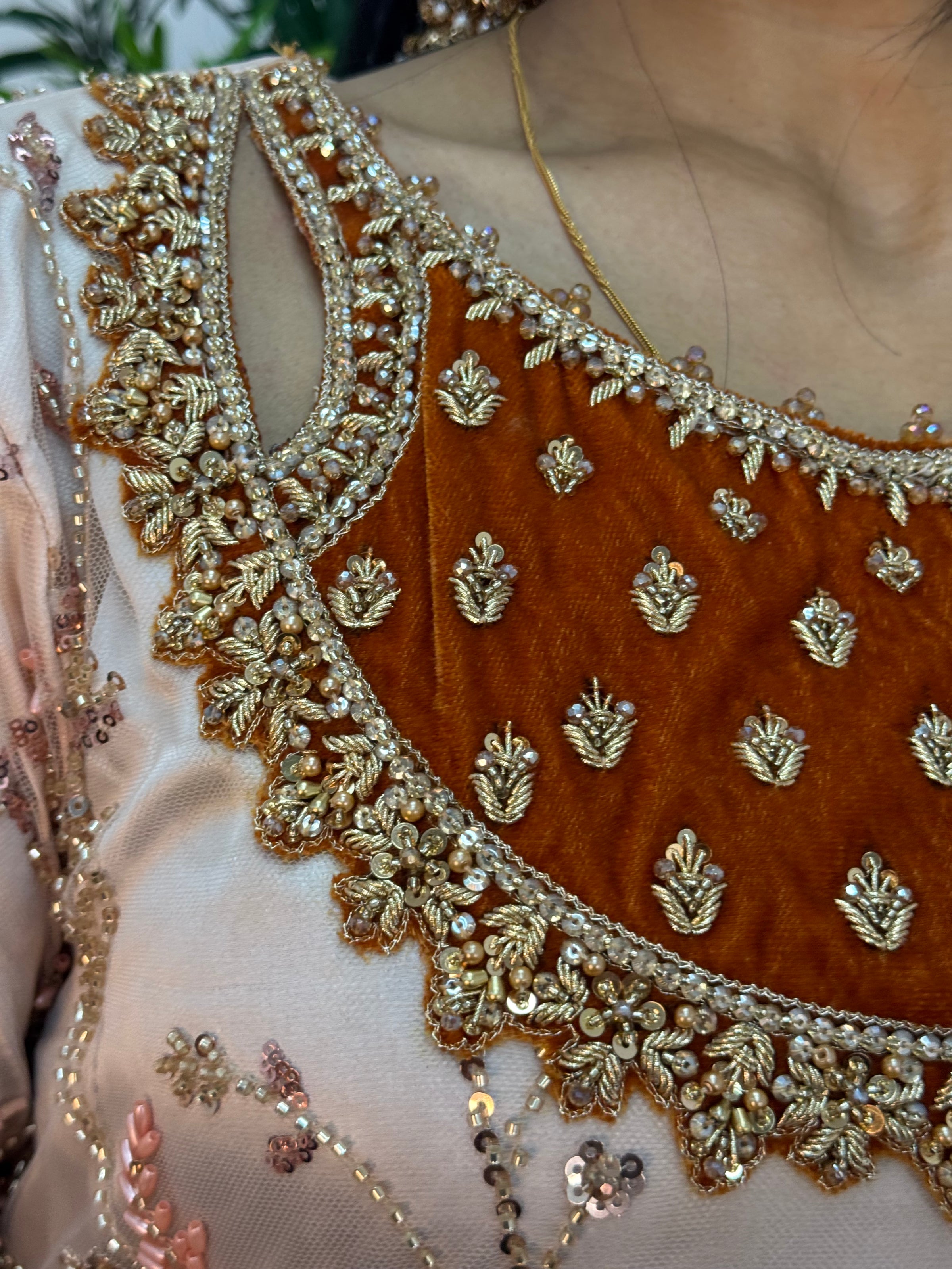 A stunning expression of luxury craftsmanship, this design features exquisite hand-embroidered Cutdana work adorning the neckline, set on rich, full velvet fabric throughout the shirt.