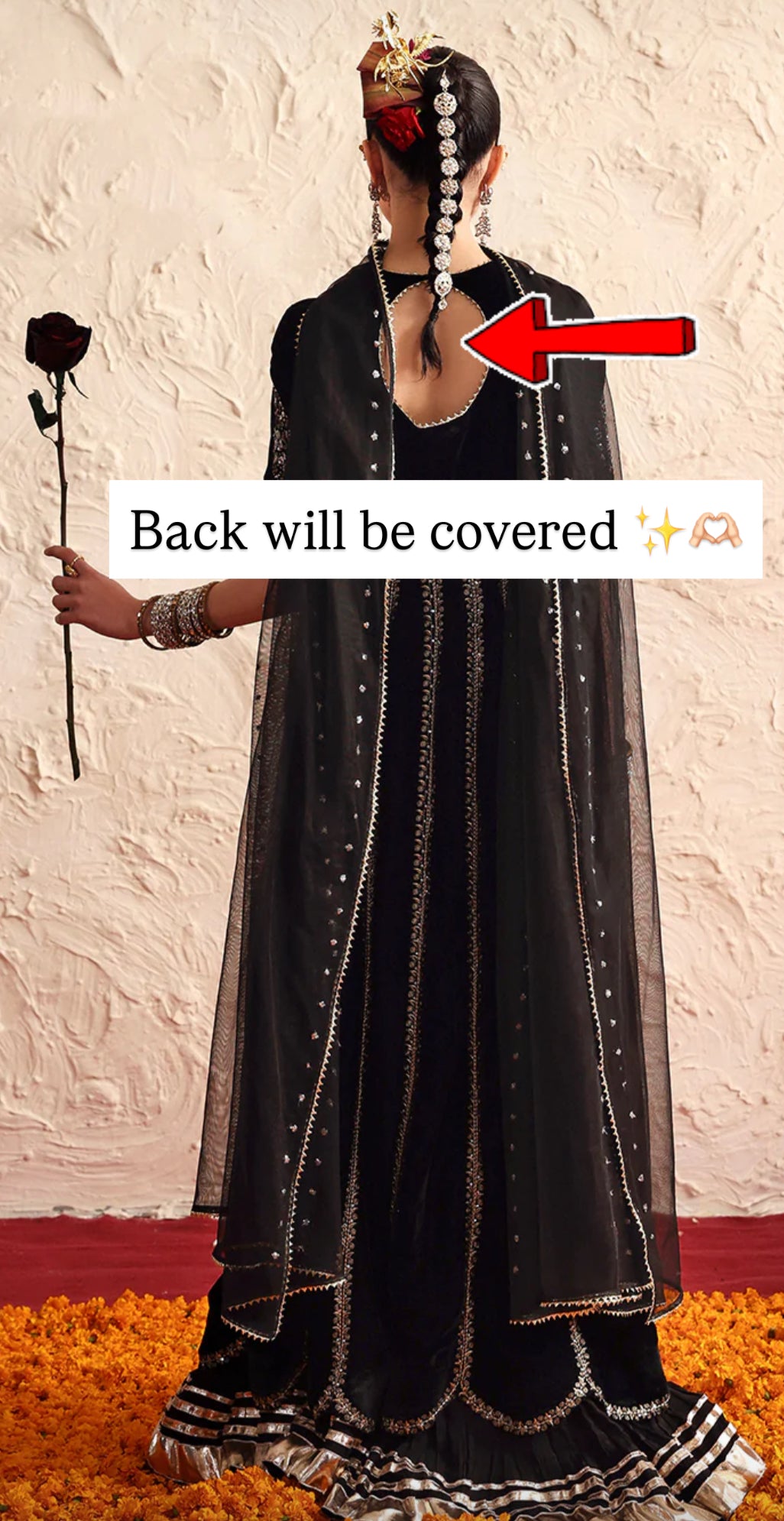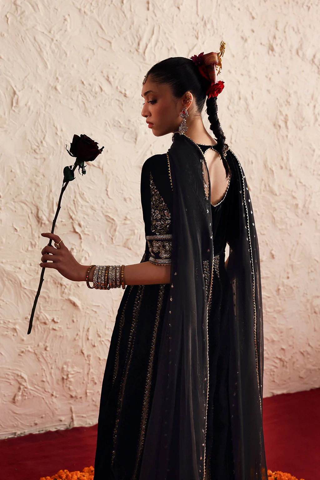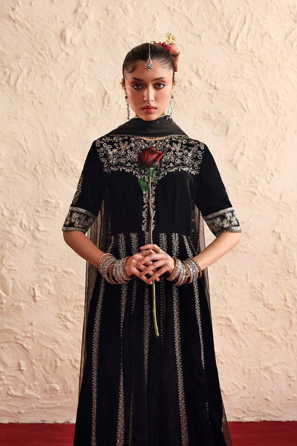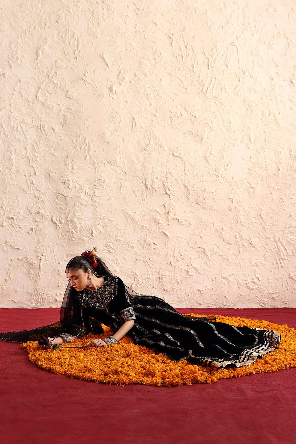 A luxurious velvet peshwas featuring intricate silver embroidery flows gracefully with its rich fall. It is paired with a delicate net dupatta adorned with matching embroidered details.