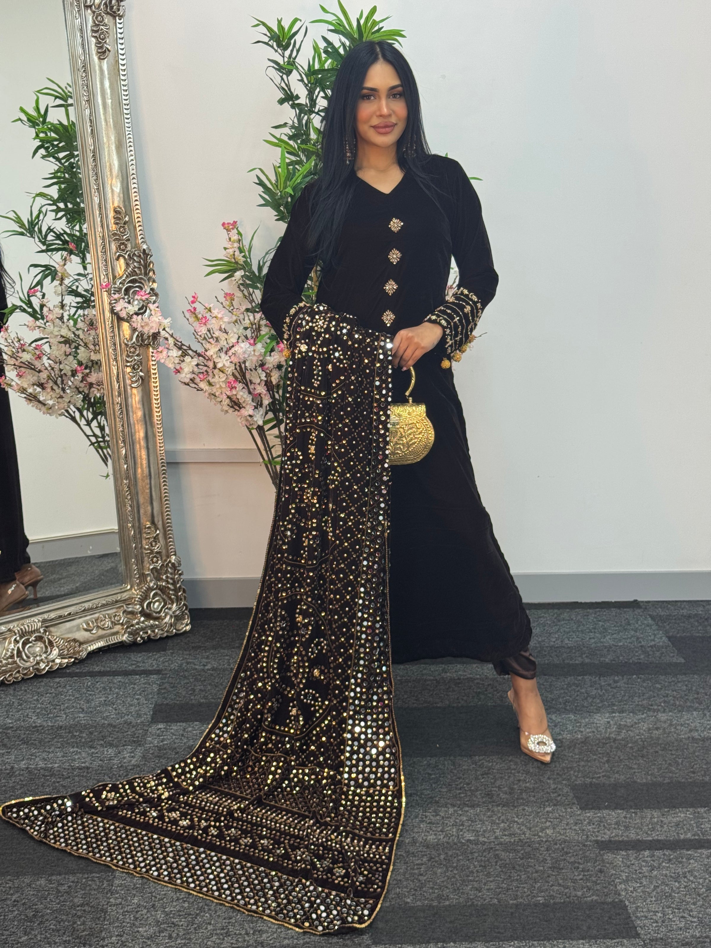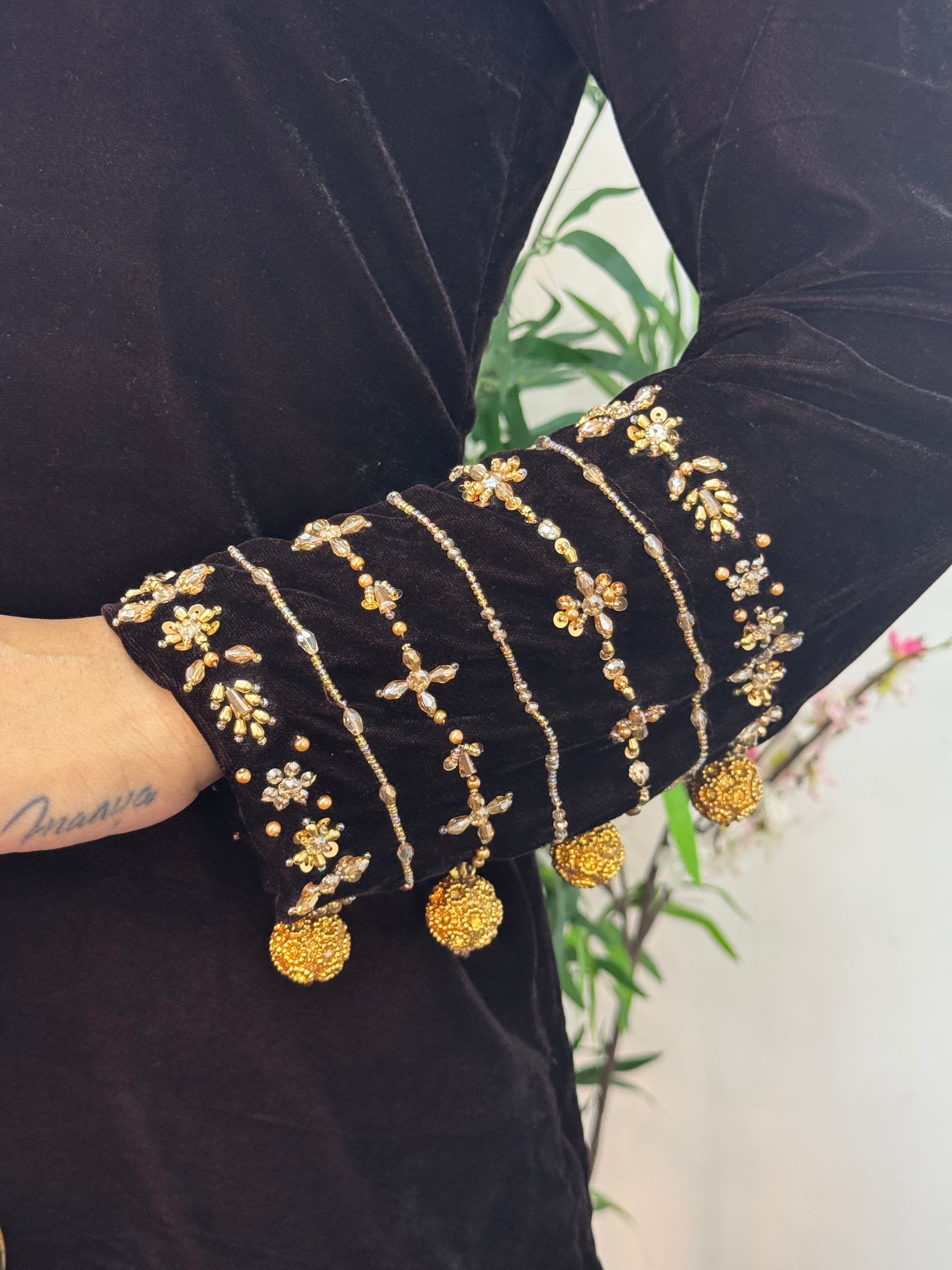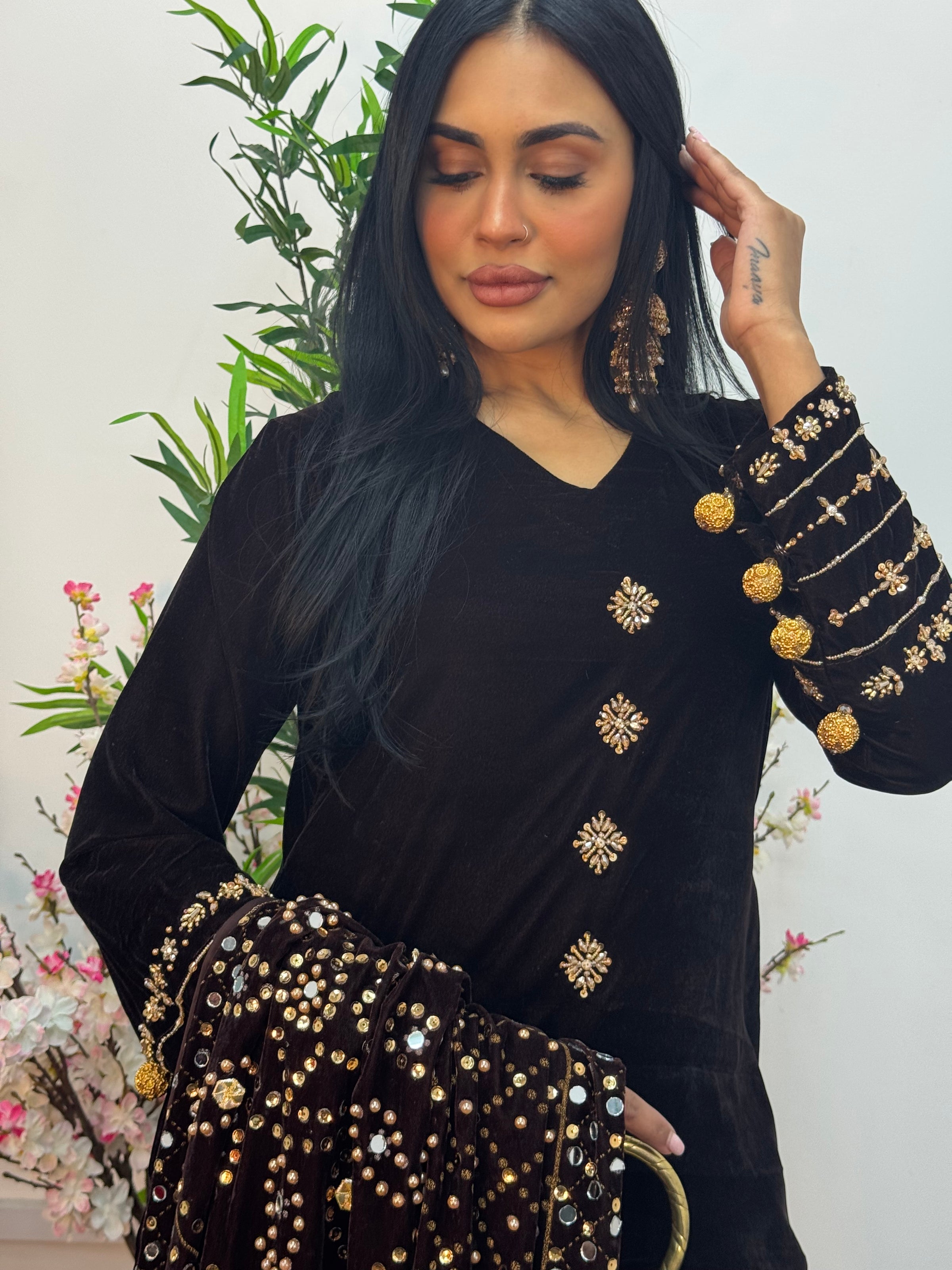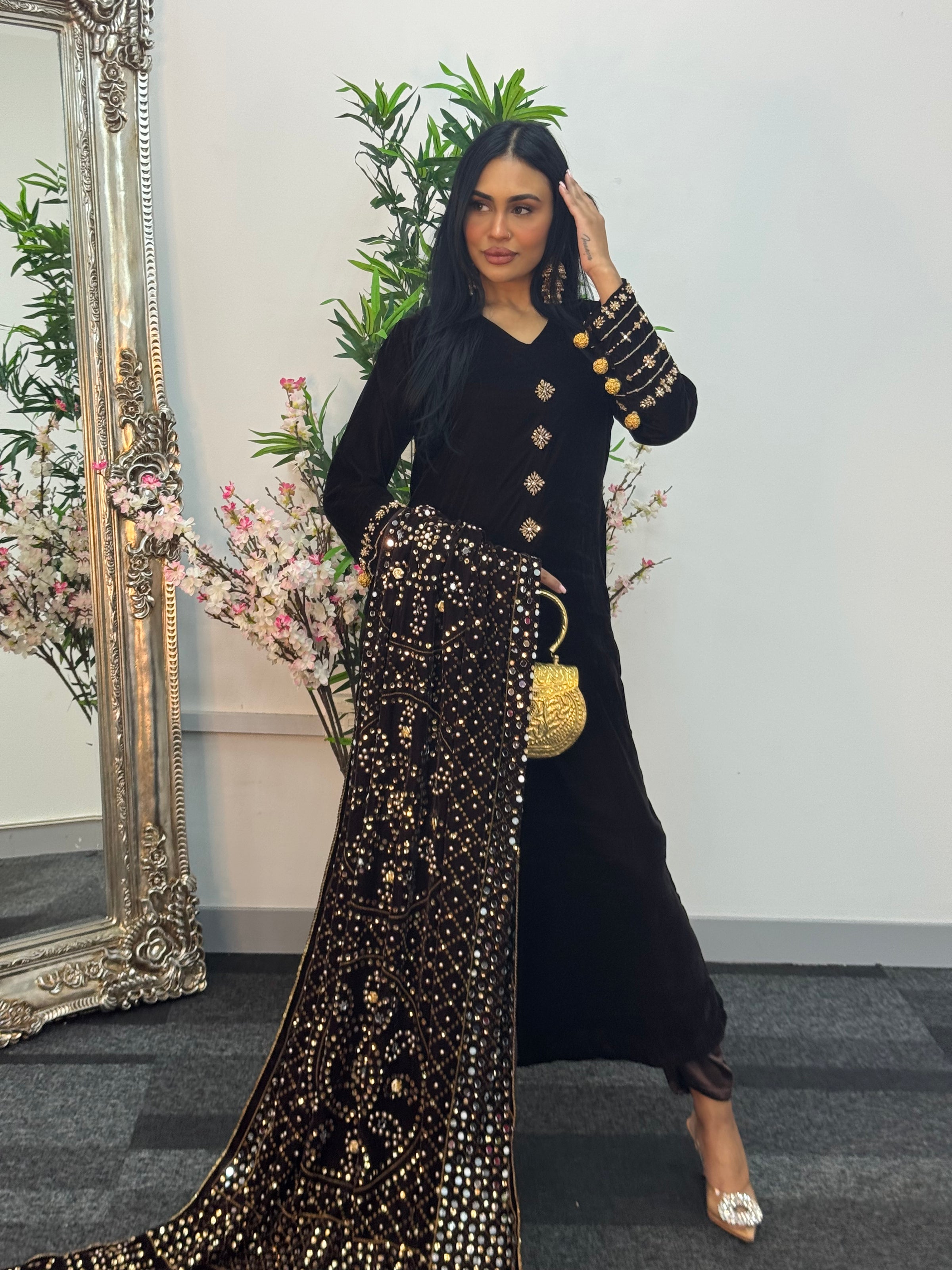 This stunning velvet ensemble features exquisite detailing, including delicate handwork along the neckline and beautifully designed sleeves adorned with hanging embellishments. The outfit is paired with straight trousers for a sleek and flattering look.